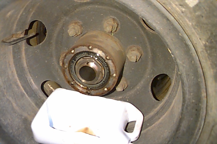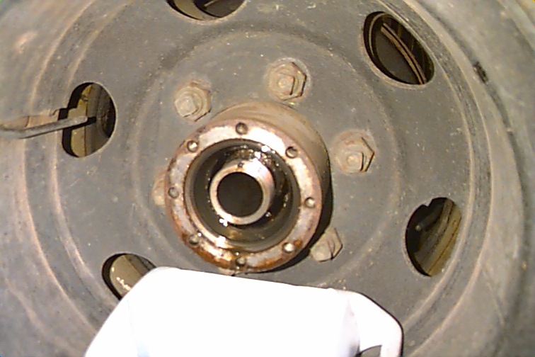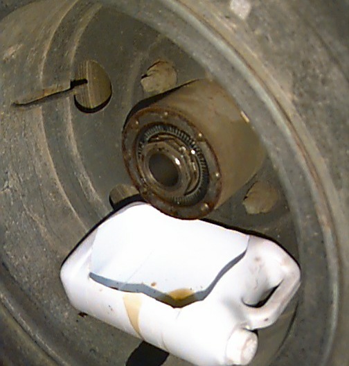 The image shows the outer surface of the outer seal, as well as the outer nut, lockwasher, and inner nut. An old jug caught the small amount of oil present.