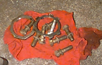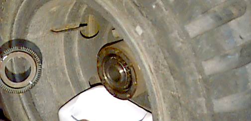 The image shows one of the wheel bearing adjusting nuts, the lock washer, and axle bolts. The lockwasher is beat up from being re-used before, and will be replaced.