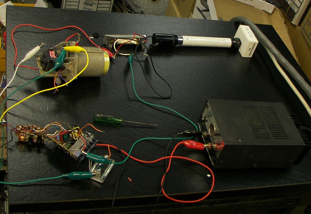 The original pulse forming network of a 36uF low-ESR capacitor charged to 800VDC and a 30uH inductor was used. To trigger the flashlamp, the pulse fom an old photoflash unit was used. The photoflash unit only produces 400VDC which was not enough to fire the laser's pump lamp. Two large tube-type high voltage power supplies were put in series to make the 800V. Later, the photoflash unit will be modified wit a voltage doubler to produce the 800V. More about the PFM can be found, along with much more info about this laser, in "Sam's Laser FAQ" at or near http://www.repairfaq.org/sam/laserscl.htm#sclsy1
