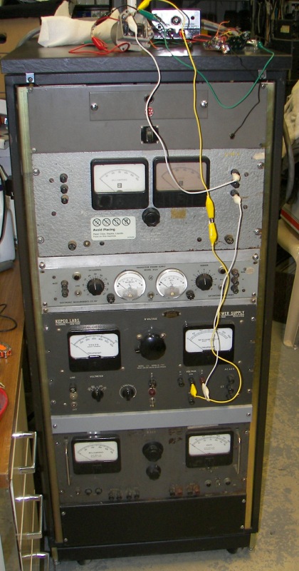 The power supplies. Nothing anywhere near this large size is necessary. Two of the vacuum-tube-regulated 0-400V supplies were put in series to make 800V for the laser. Tube gear rocks.