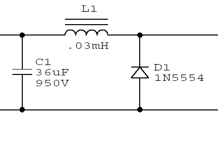 The original pulse forming network of a 36uF low-ESR capacitor charged to 800VDC and a 30uH inductor was used. To trigger the flashlamp, the pulse fom an old photoflash unit was used. The photoflash unit only produces 400VDC which was not enough to fire the laser's pump lamp. Two large tube-type high voltage power supplies were put in series to make the 800V. Later, the photoflash unit will be modified wit a voltage doubler to produce the 800V. More about the PFM can be found, along with much more info about this laser, in "Sam's Laser FAQ" at or near http://www.repairfaq.org/sam/laserscl.htm#sclsy1
