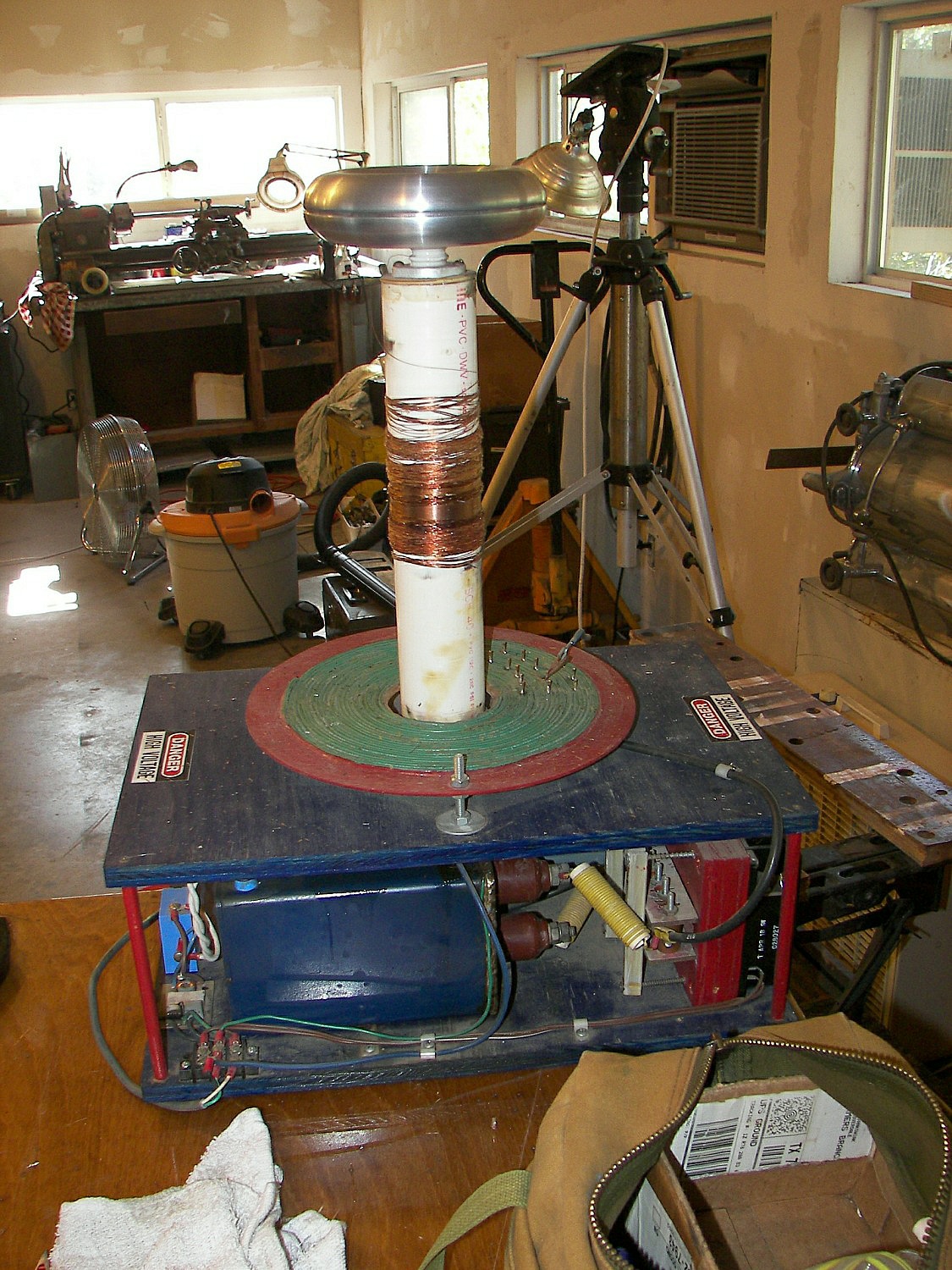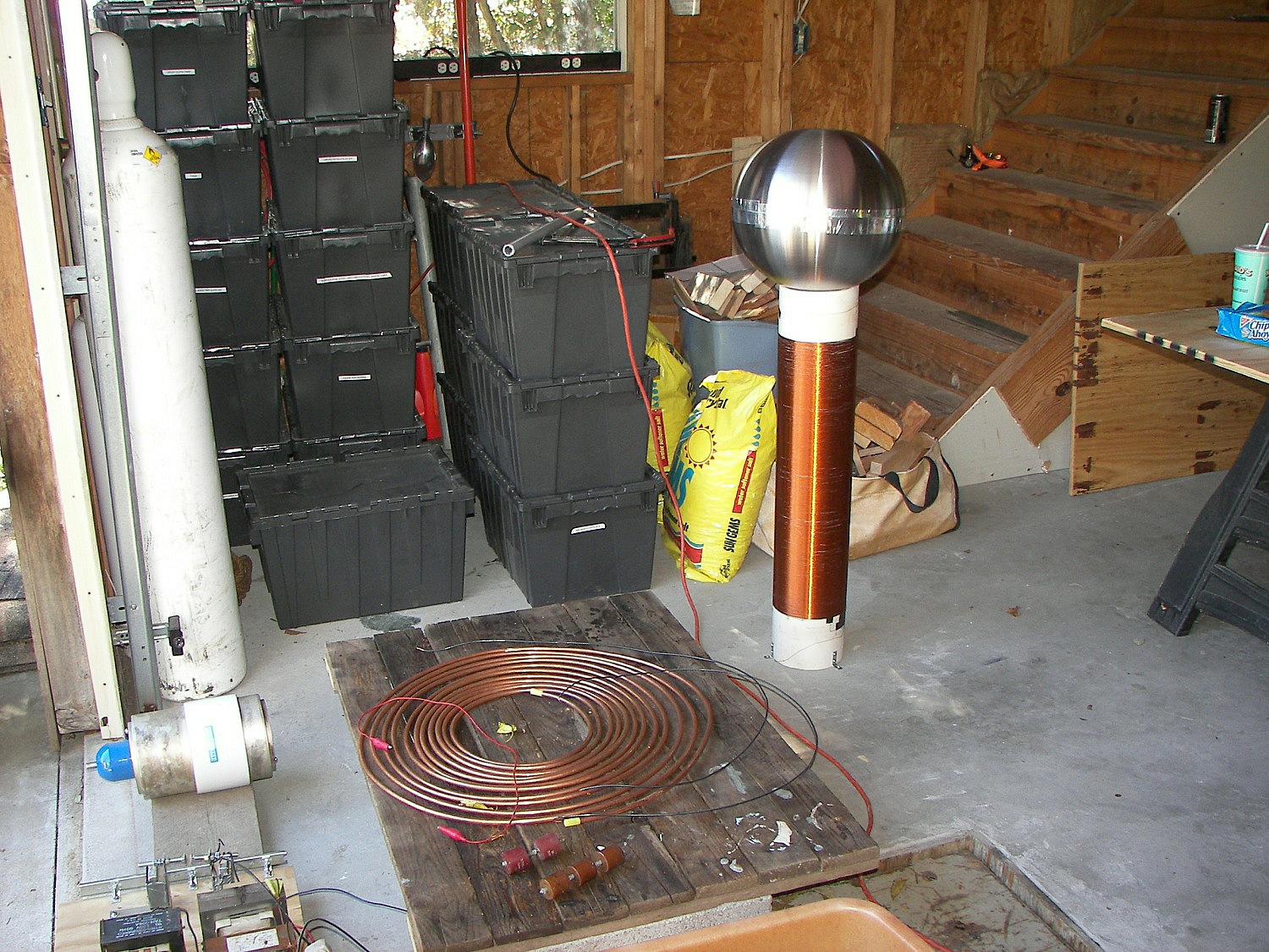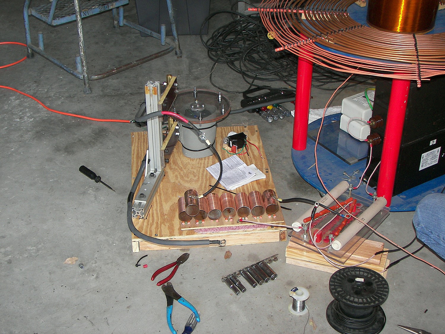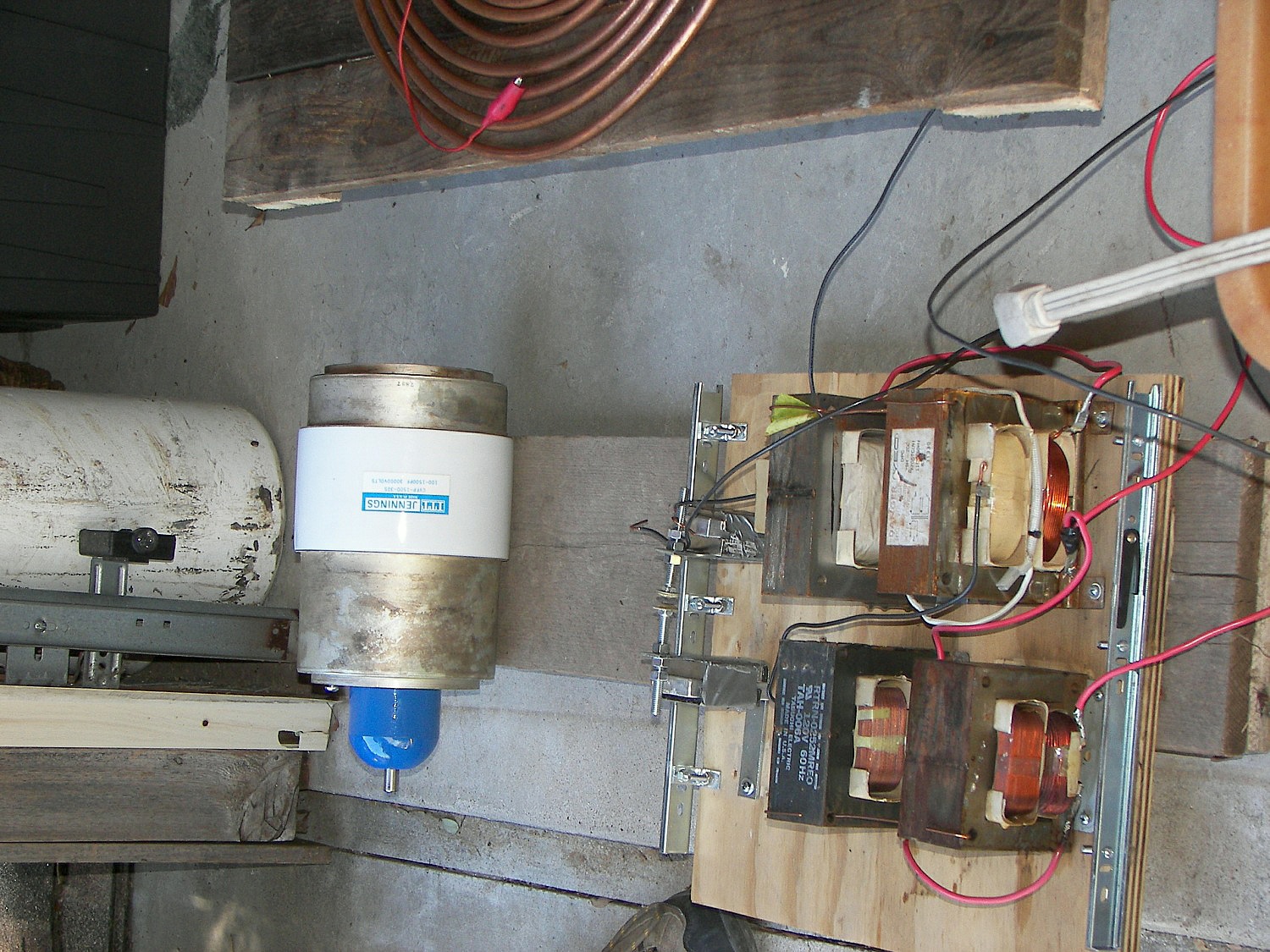 The next coil, which will be referred to as the "small TC", stood about 4 FT tall without the top load. After some tuning an the stacking of three top loads, it produced arcs of 4-5 ft. length which would seem to be well over a million volts. This coil was powered first by two neon sign transformers and then by a 13,500V potential transformer. The capacitors were maxwell type energy storage capacitors rated for 800Hz discharge. The cap was a variable speed rotary design. The coil was built by two teenagers under the direction of Mr. Pool and his learned associates. During the tuning, it was discovered that the overhead garage door had not been grounded. This resulting in an arc at the garage door motor and a small flame, which extinguished as soon as the power was removed. Once the door was grounded, the incident did not repeat. This coil made spectacular hot arcs.