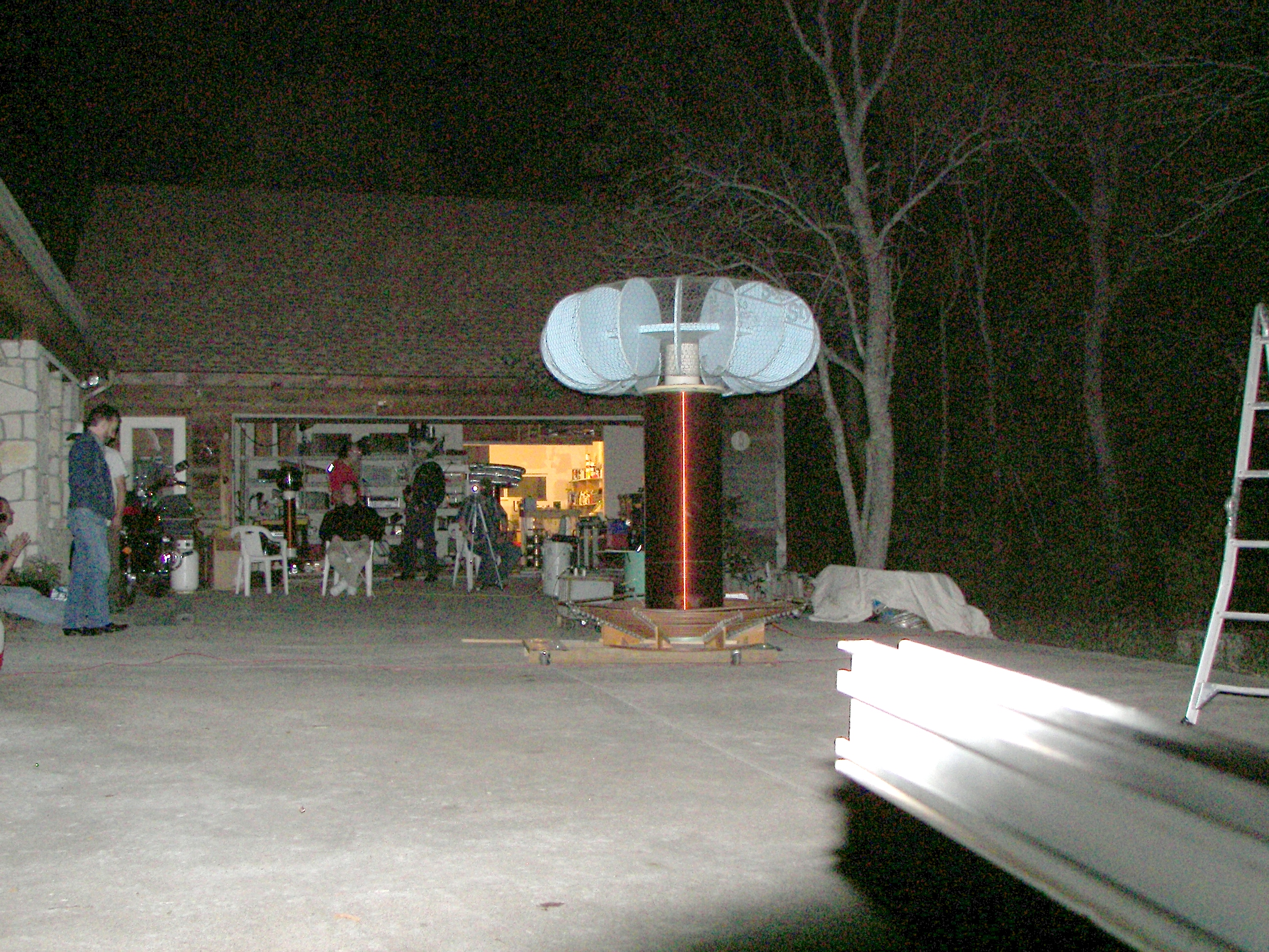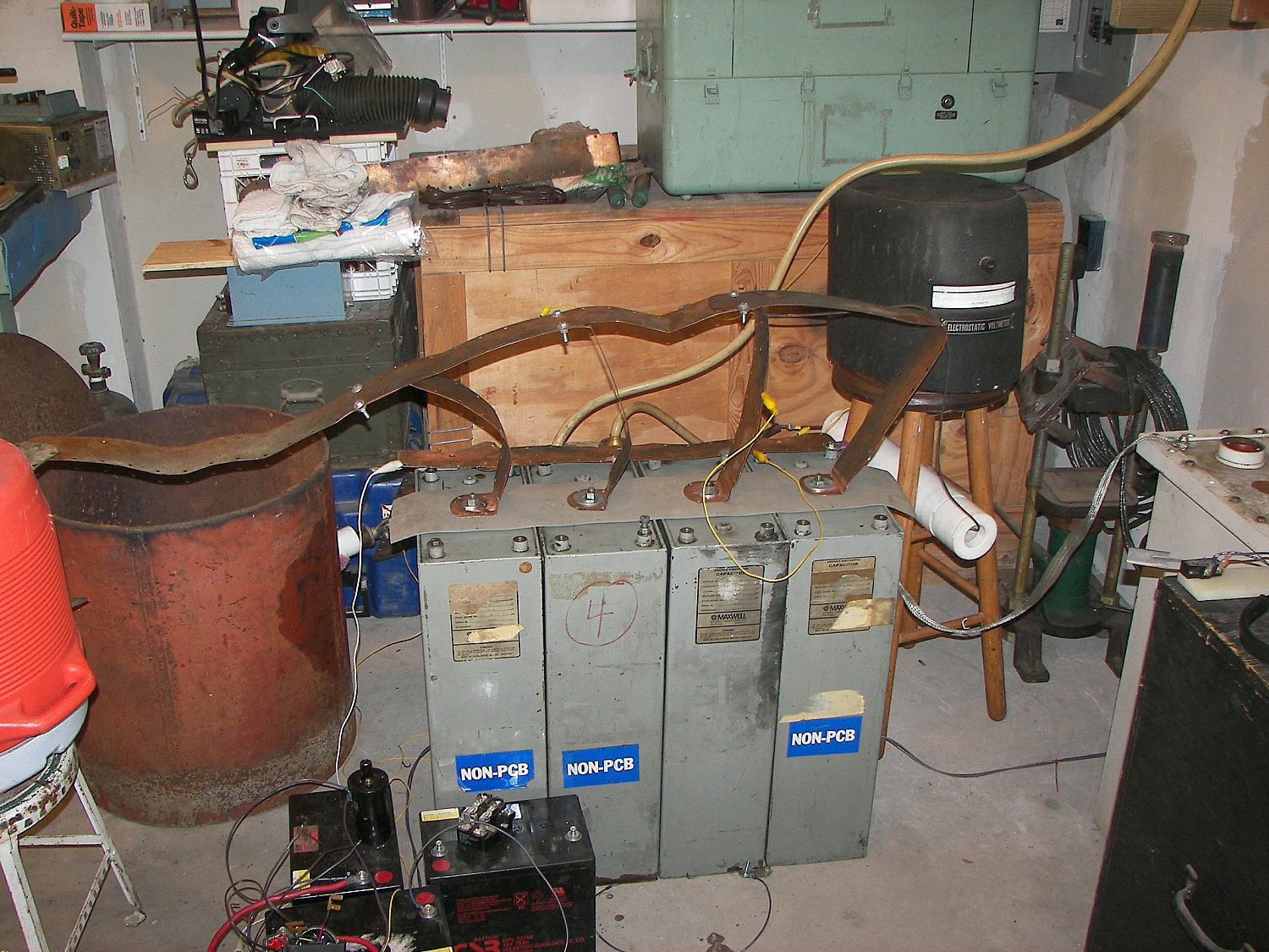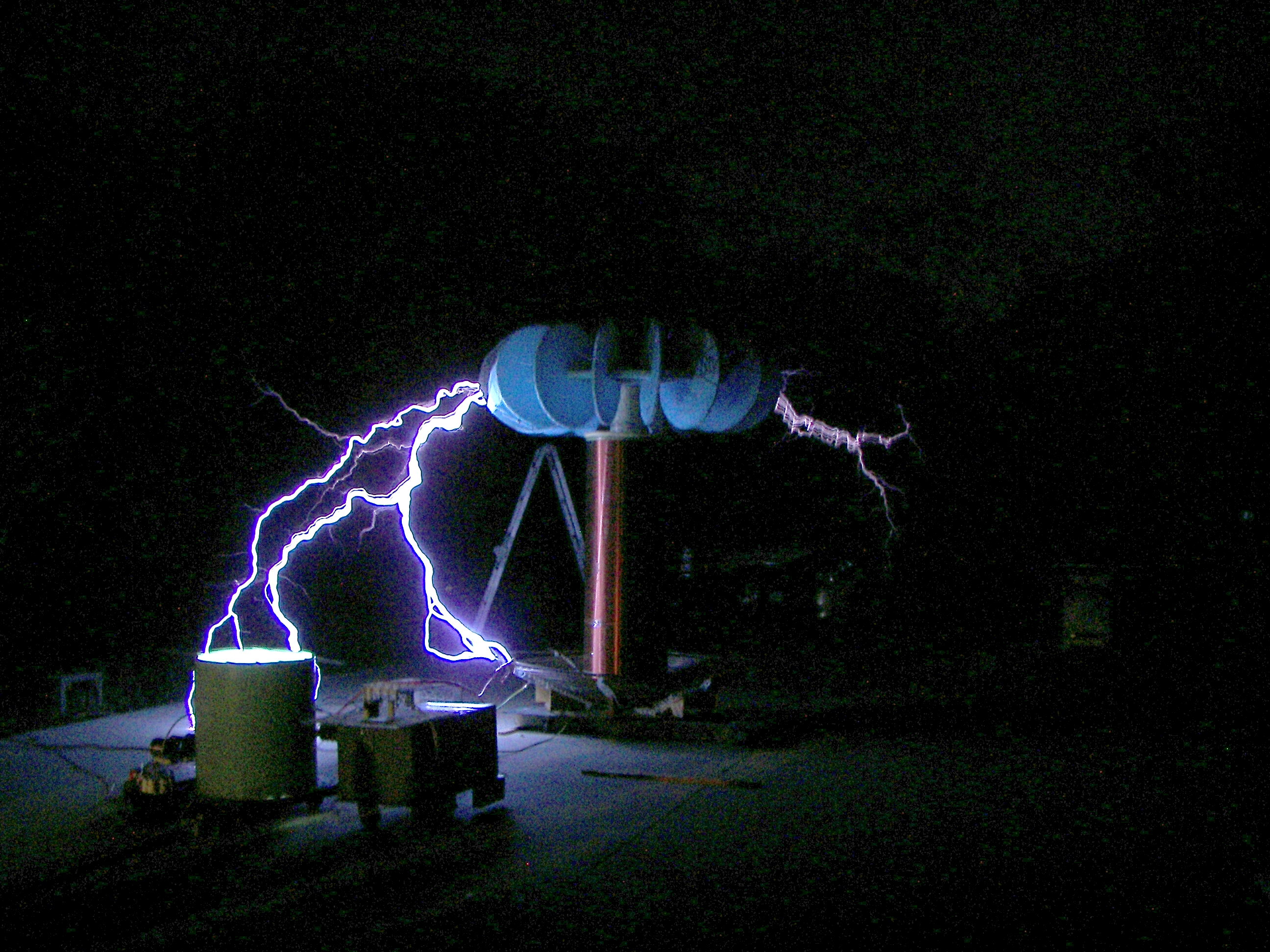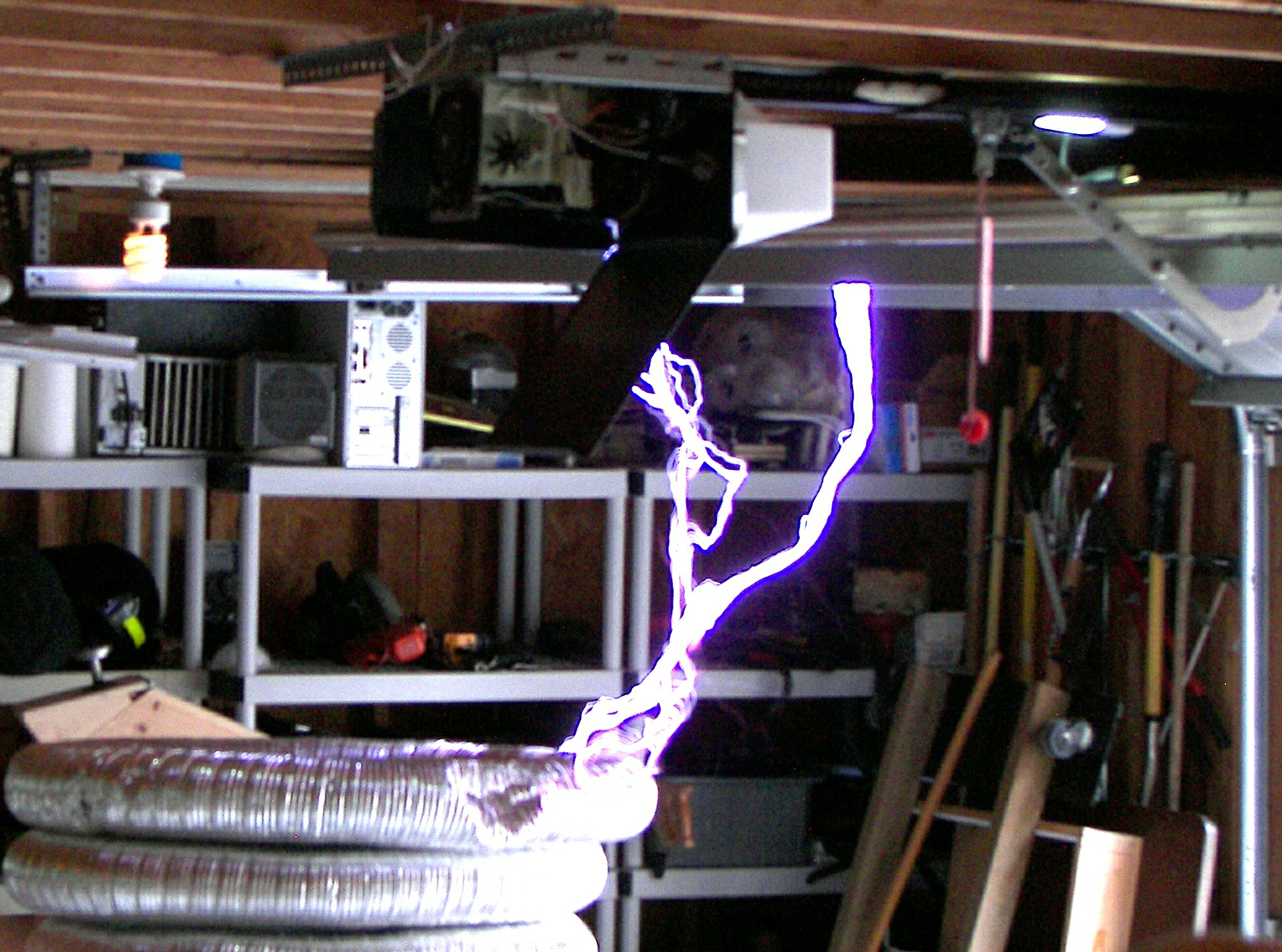The next coil, which will be referred to as the "small TC", stood about 4 FT tall without the top load. After some tuning an the stacking of three top loads, it produced arcs of 4-5 ft. length which would seem to be well over a million volts. This coil was powered first by two neon sign transformers and then by a 13,500V potential transformer. The capacitors were maxwell type energy storage capacitors rated for 800Hz discharge. The cap was a variable speed rotary design. The coil was built by two teenagers under the direction of Mr. Pool and his learned associates. During the tuning, it was discovered that the overhead garage door had not been grounded. This resulting in an arc at the garage door motor and a small flame, which extinguished as soon as the power was removed. Once the door was grounded, the incident did not repeat. This coil made spectacular hot arcs.