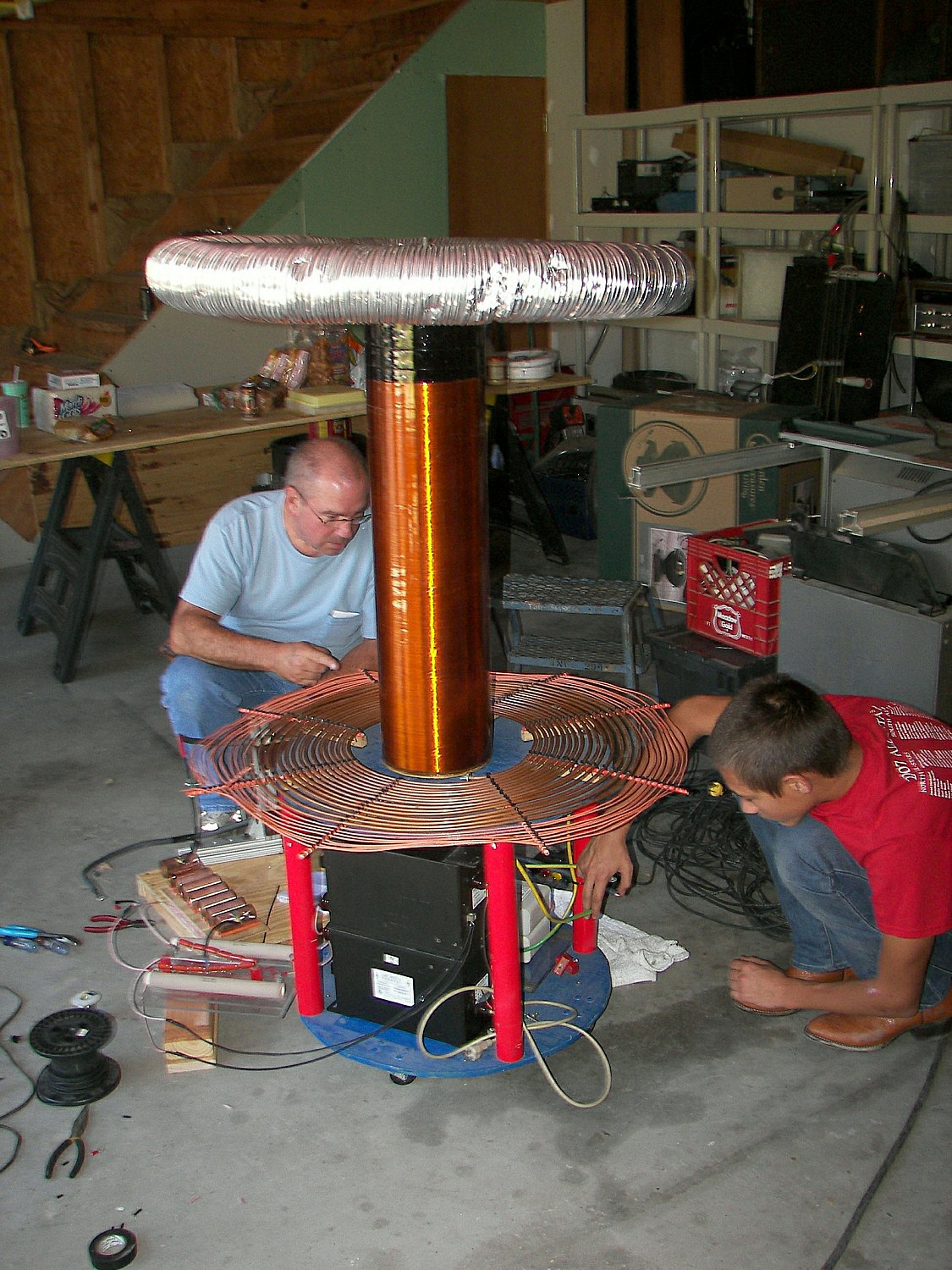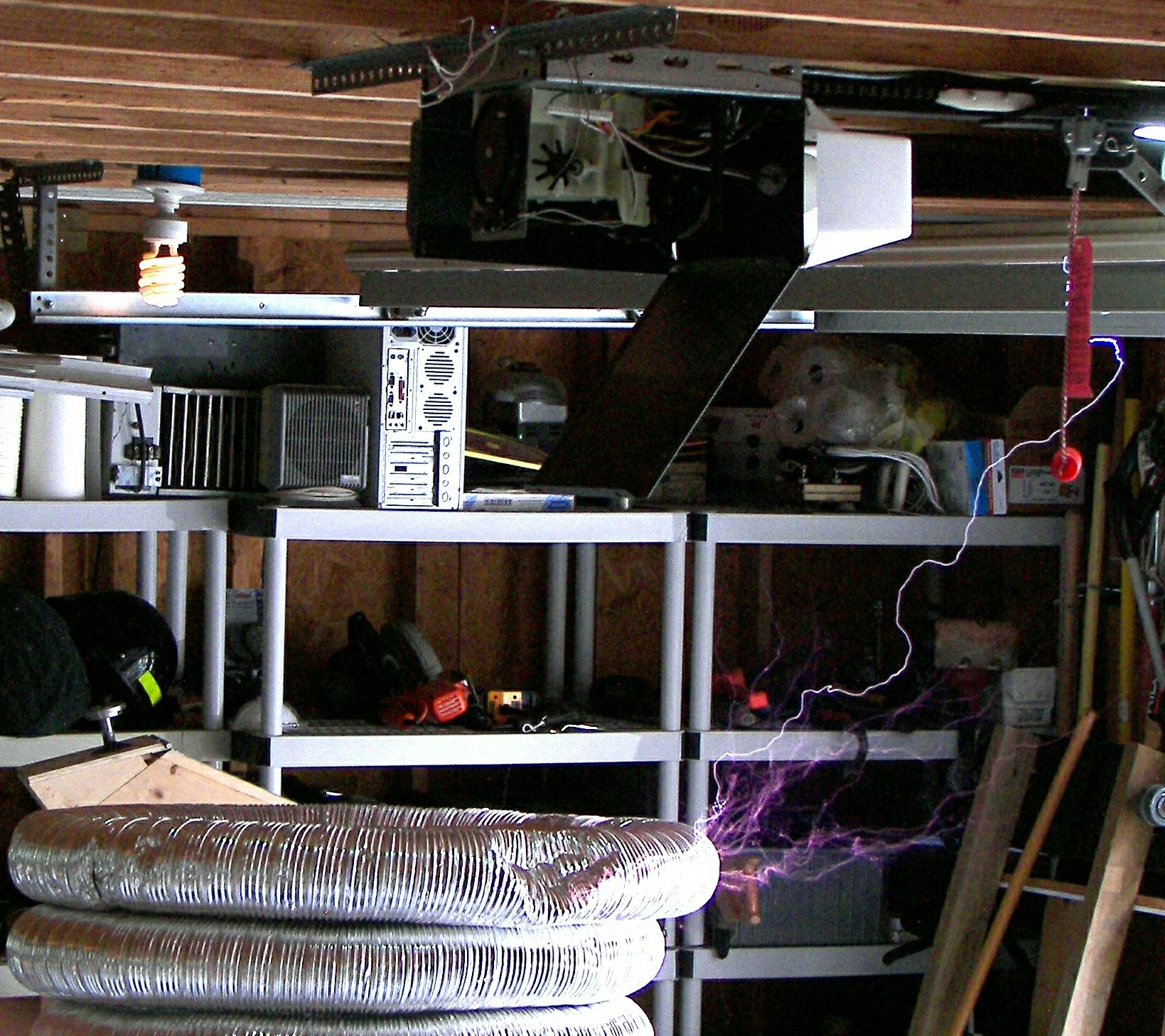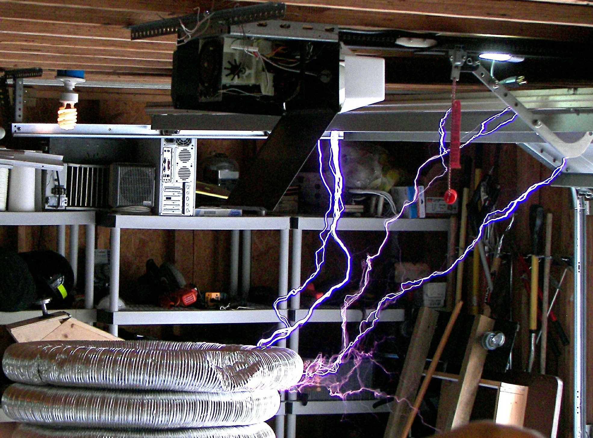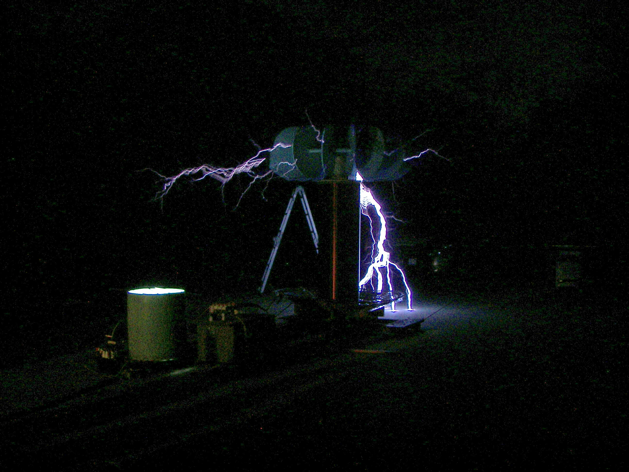 The next coil, which will be referred to as the "small TC", stood about 4 FT tall without the top load. After some tuning an the stacking of three top loads, it produced arcs of 4-5 ft. length which would seem to be well over a million volts. This coil was powered first by two neon sign transformers and then by a 13,500V potential transformer. The capacitors were maxwell type energy storage capacitors rated for 800Hz discharge. The cap was a variable speed rotary design. The coil was built by two teenagers under the direction of Mr. Pool and his learned associates. During the tuning, it was discovered that the overhead garage door had not been grounded. This resulting in an arc at the garage door motor and a small flame, which extinguished as soon as the power was removed. Once the door was grounded, the incident did not repeat. This coil made spectacular hot arcs.