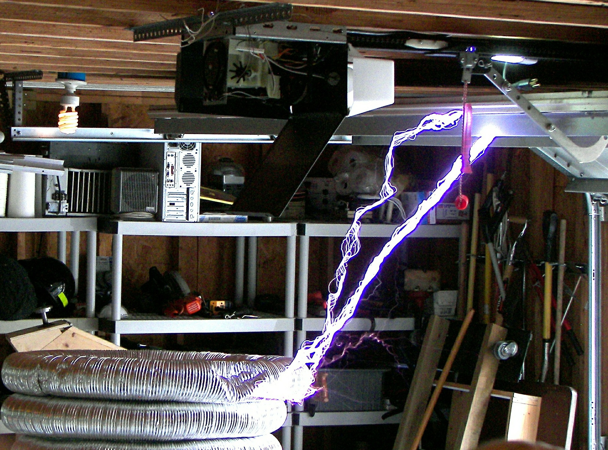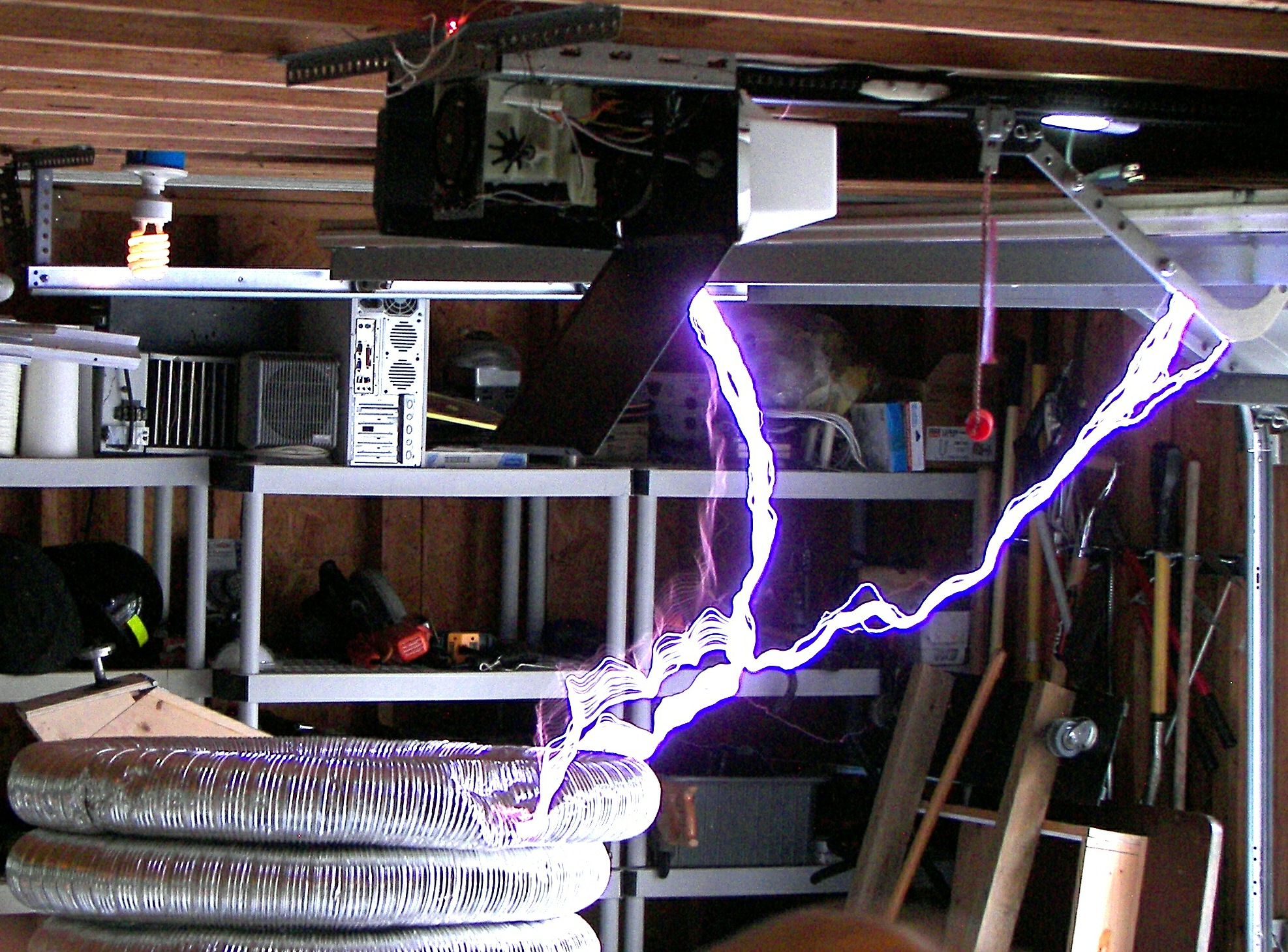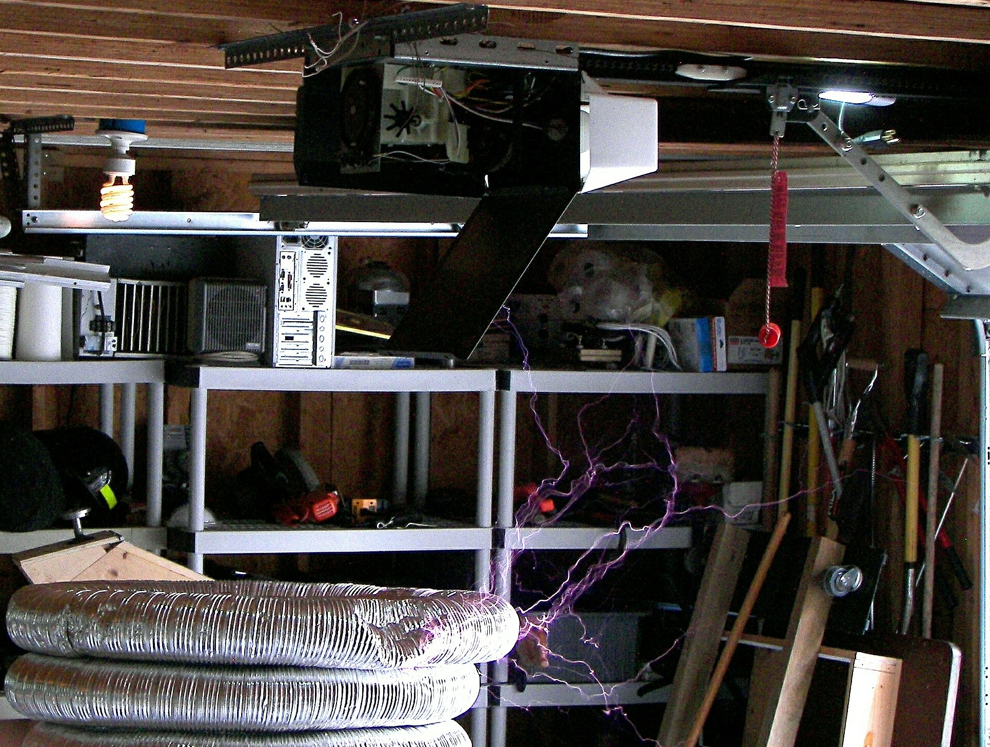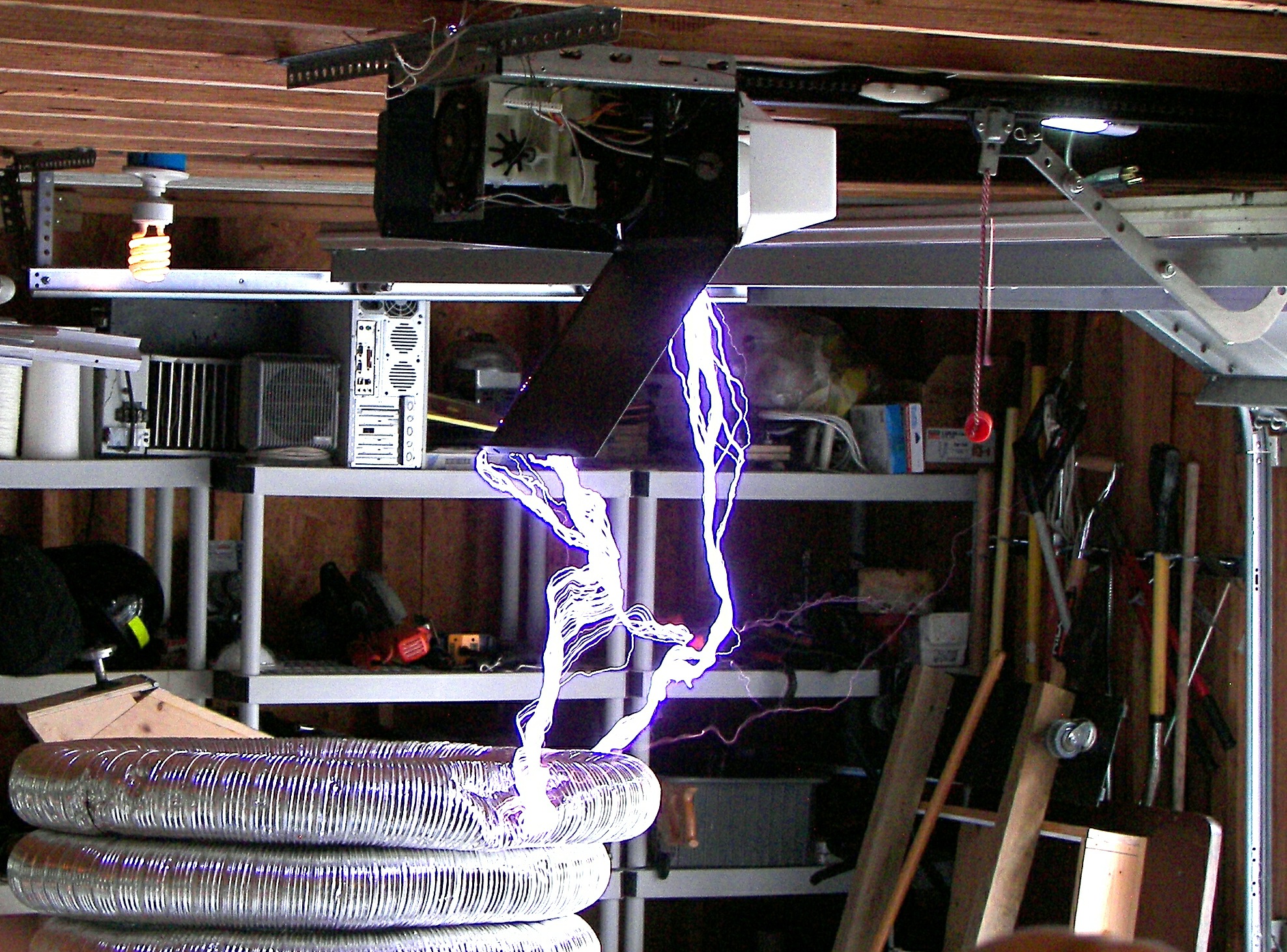 The next coil, which will be referred to as the "small TC", stood about 4 FT tall without the top load. After some tuning an the stacking of three top loads, it produced arcs of 4-5 ft. length which would seem to be well over a million volts. This coil was powered first by two neon sign transformers and then by a 13,500V potential transformer. The capacitors were maxwell type energy storage capacitors rated for 800Hz discharge. The cap was a variable speed rotary design. The coil was built by two teenagers under the direction of Mr. Pool and his learned associates. During the tuning, it was discovered that the overhead garage door had not been grounded. This resulting in an arc at the garage door motor and a small flame, which extinguished as soon as the power was removed. Once the door was grounded, the incident did not repeat. This coil made spectacular hot arcs.