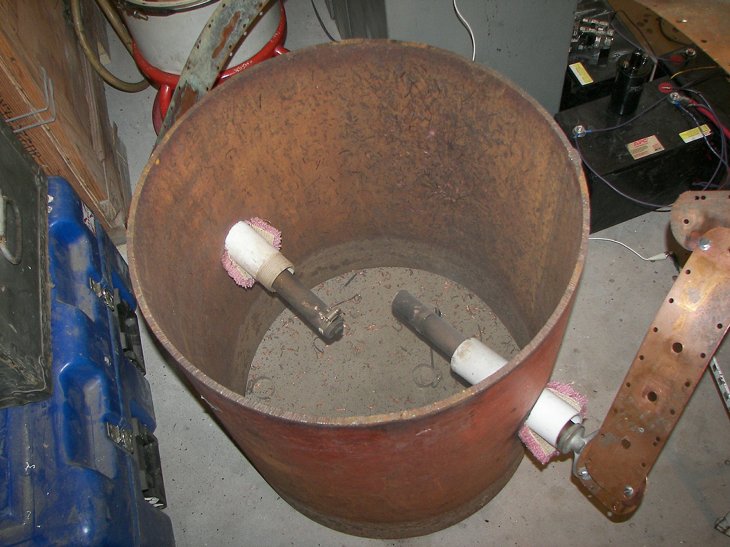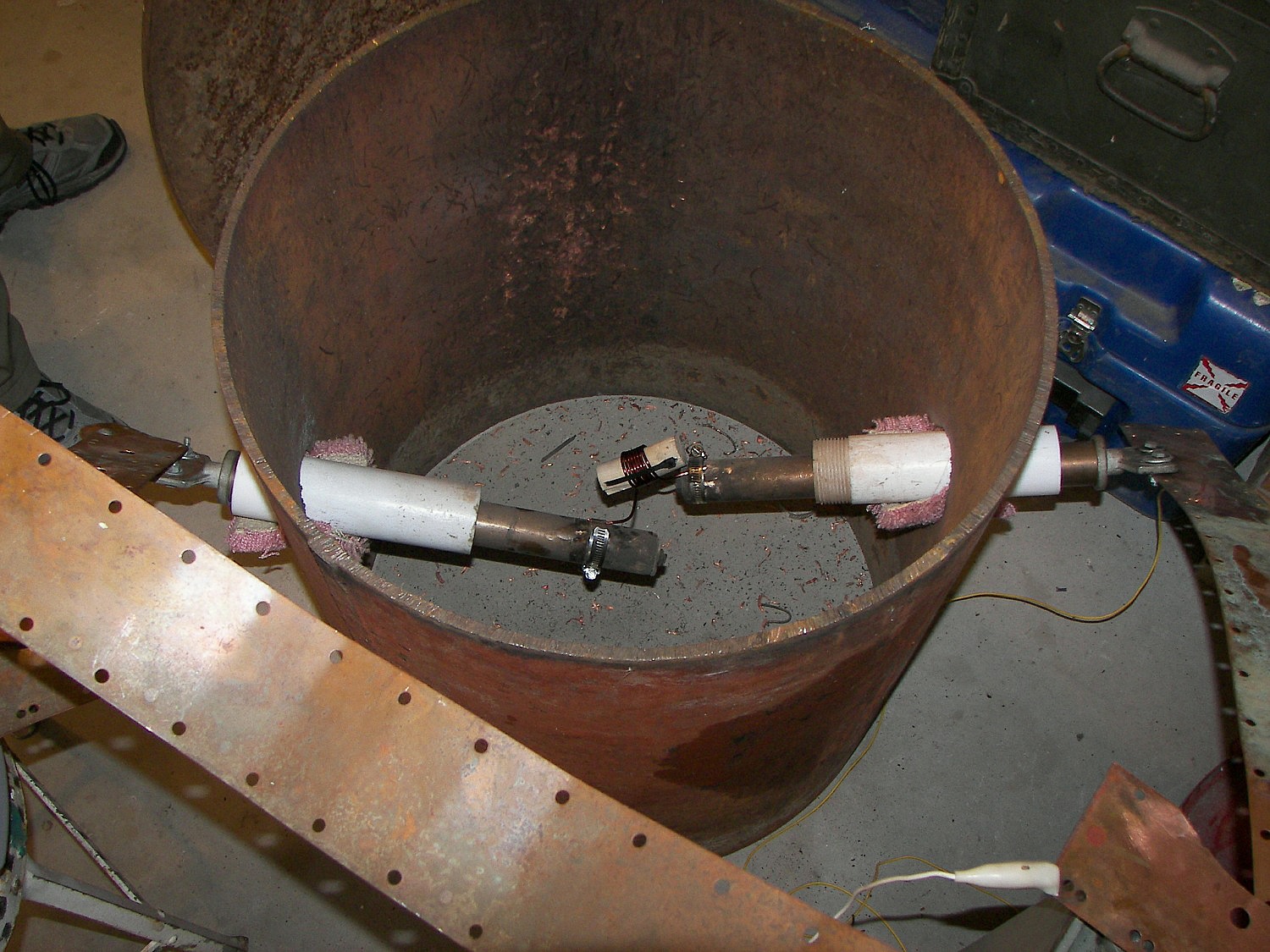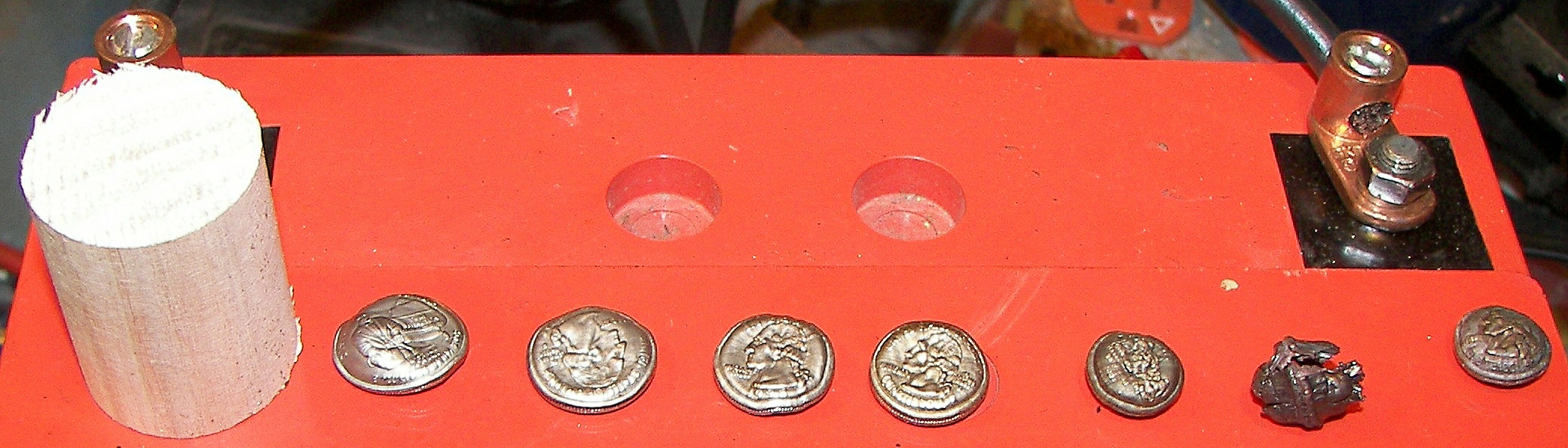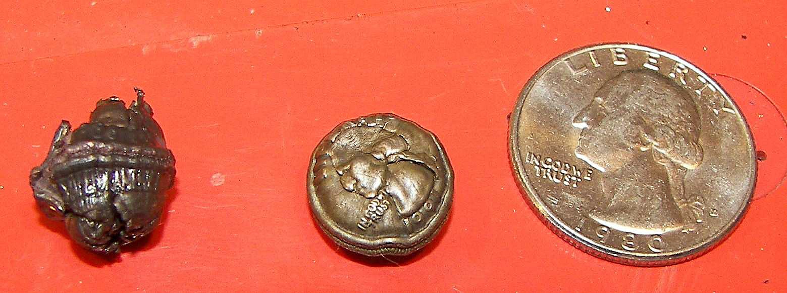 The event began with Wild Bill shrinking some coins. Quarters seemed to be the best targets. A bank of 13.5uF 40KV energy storage capacitors was used. Some experimentation waas required to get the energy delivery profile aligned. This involved adjusting the final charge on the capacitor bank, the number of turns around the coin, and in some cases removing one capacitor from the bank. The work coil was enclosed in a thick wall steel drum with a removable 1/2" thick top. The coil was sandwiched betweek two halves of a section of wooden dowl and the coil slipped oveer it. The assembly was secured with wire ties which were inevitable destroyed along with the coil. In one case, the dowell/coin assembly was wrapped with some thick tape and then the coil slipped on. Interestingly the tape held against the tremendous pressure during the process. The discharge was triggered by a ball gap with a washer in the center. the washer would receive a high voltage pulse from a spark coil and arc to one of the main gap electrodes. This would ionize the air in the gap and initiate the discharge. The process was carried out with the brisance and acoustic volume of a gunshot. To charge the capacitor bank, an X-ray power supply was employed, the voltage being adjusted by a variable autotransformer. Appropriately, a large two pole knife switch was used to connect and disconnect the mains. Between the bank and the load, a transient filter was connected so that any mis-discharge would not go back into the power supply. During one shot, the capacitors were accidentally charged to 38KV. The quarter was nearly destroyed and started to fragment. Considering the quickness with which this happened, perhaps 1 or 2 miliseconds, the peak power may have been 17-35 megawatts. Inside the shrinking chamber may be seen many small pieces of copper from past coils, The coil is sacrificed each shot. Markings on the inside of the chamber reveal the force with which the coil is destroyed during the process. The copper straps are approximately 3" wide and 1/32" thick. After each shot, the bank must be discharged the rest of the way. It may have several hundred volts remaining. A soda can on a stick was used to short the terminals to the case. There ended up being several holes in the can after a few uses. This sort of science fun continued thoughout the event and no one got bored with it at all considering the many factors which could be changed incrementally for each shot and the resulting closely graded sizes of quarters produced. I regret not having an image of all the quarters, but the few shown should illustrate the point.