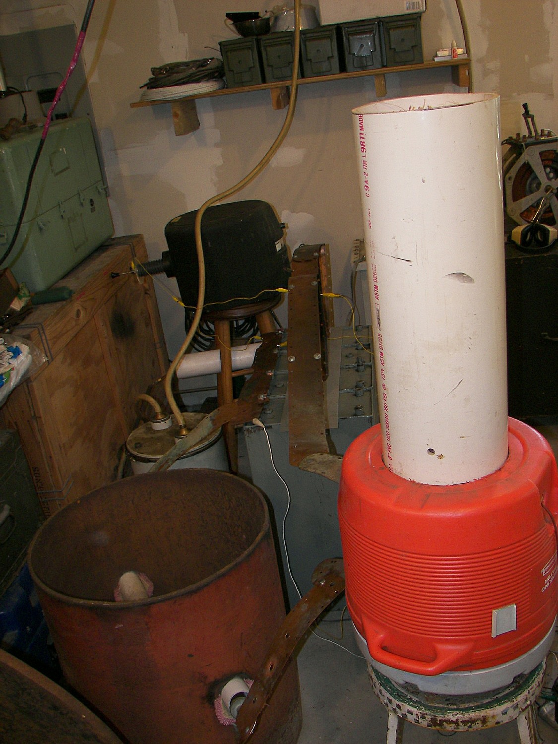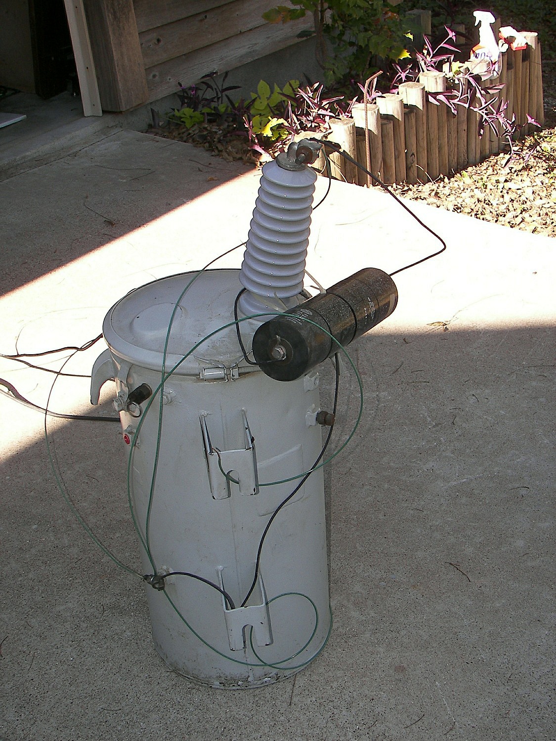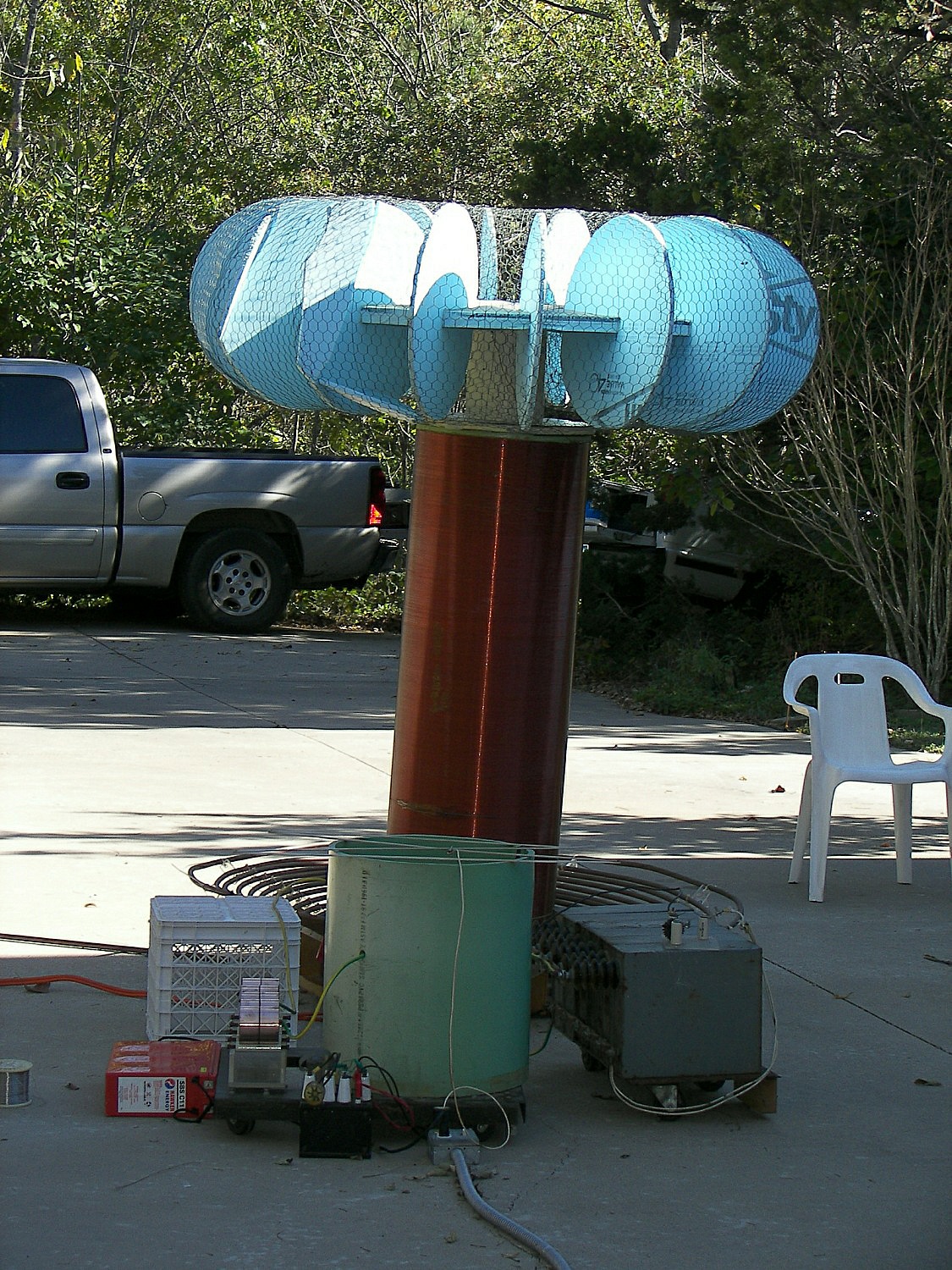 The largest coil, named "The Hog", had to be assembled outdoors due to its physical size. The secondary was about 24" diameter and over 6FT in height. It seems to be wound with #14 wire. The top load was some 4-5FT diameter. The images show the size of the ballast resistors and stack of variable autotransformers as well as the "pole pig" used to supply the high voltage to the primary. The arcs from this coil ocasionally reached 12 feet in length. Inside the green drum is the rotary gap. It uses a low voltage AC motor fed by an old transmitting-style VH rectifier filament transformer for insulation. Four large oil capacitors are stacked together near the gap. During one run, a 3" tall ceramic insulator used for suplying the primary coil was split right in half down the center of the long axis.