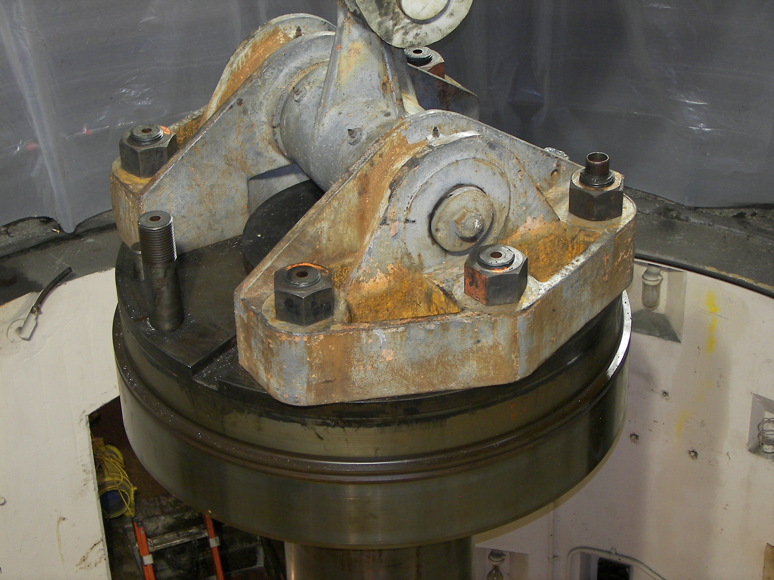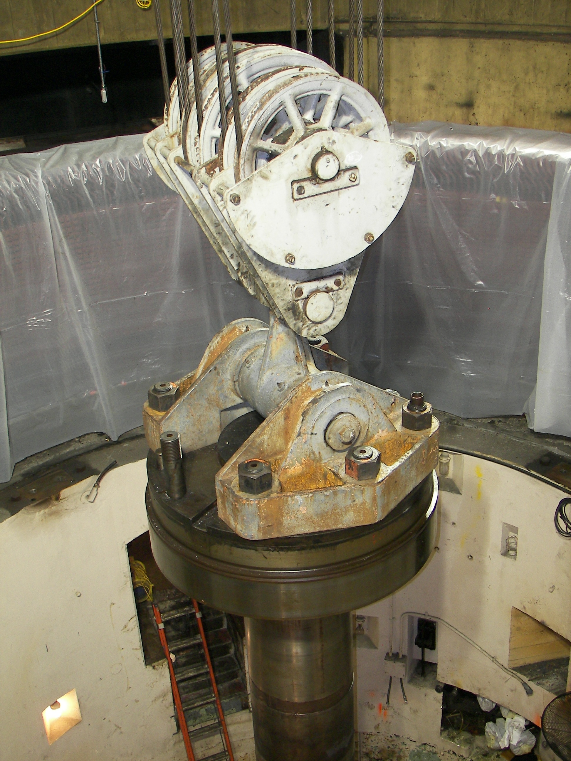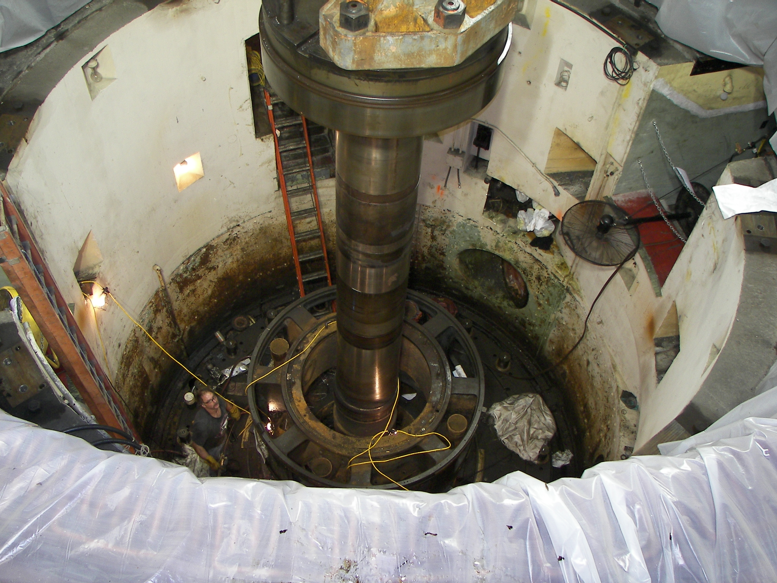 When I arrived at 10PM, the unit had been disassembled to the point of removing the shaft. Since the shaft is pressed into the runner with a 0.002 - 0.003" interference fit, it was taking some time to remove the 30-ton shaft and a couple of shifts had already been spent getting it free. It was now held in place by a 150 ton crane. The nuts and bolts there at the top are larger than they look. If I recall, the bolts are at least 3" diameter. The thrightmost image shows the machinery pit to be empty except the shaft.